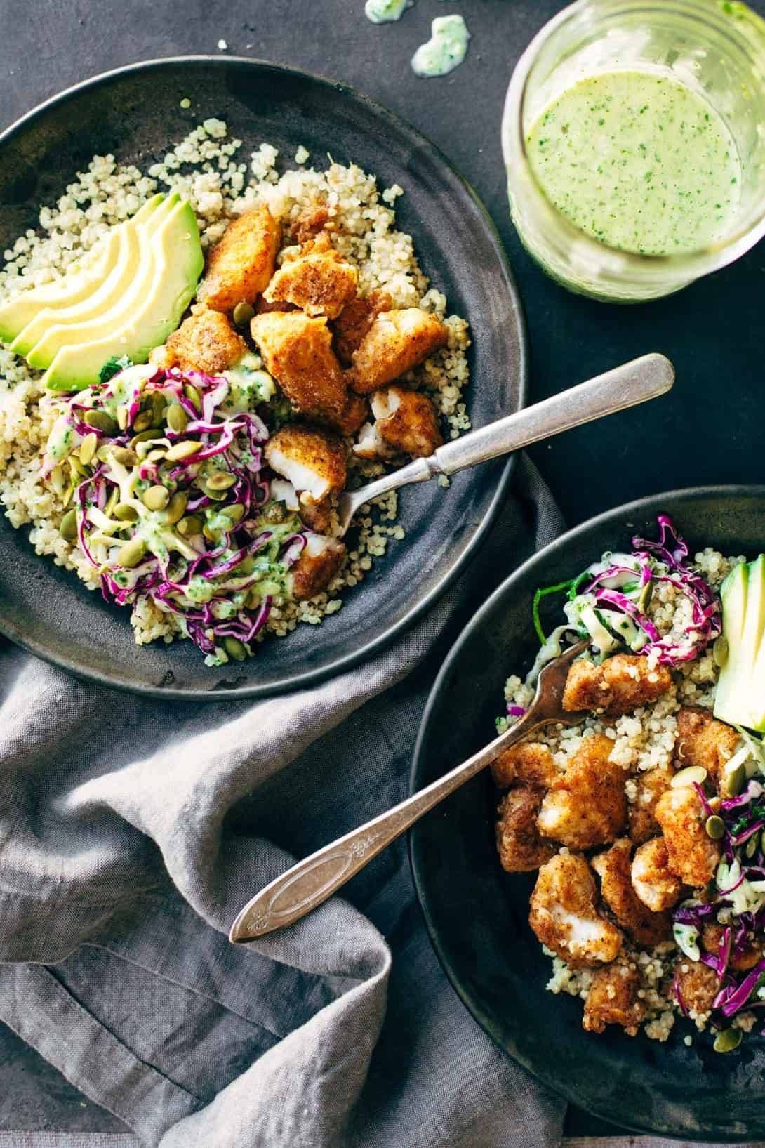Spicy Fish Taco Bowls with Cilantro Lime Slaw